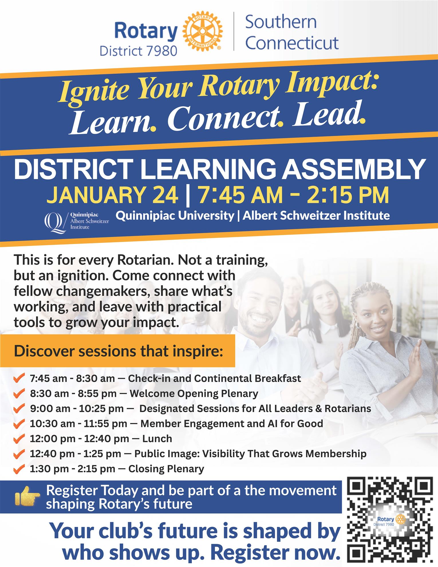 Kick off the new Rotary year with inspiration, great ideas, and a few “aha!” moments at our District Assembly on January 24, 2026, from 7:45 AM to 1:30 PM at the Albert Schweitzer Institute at Quinnipiac University.