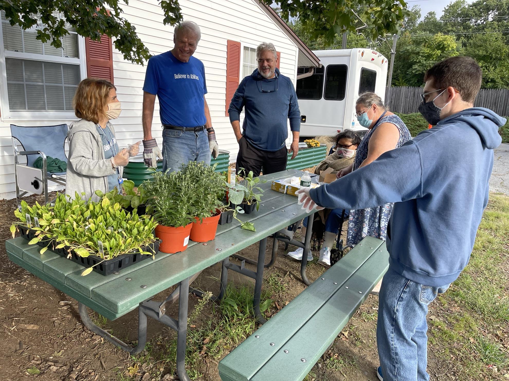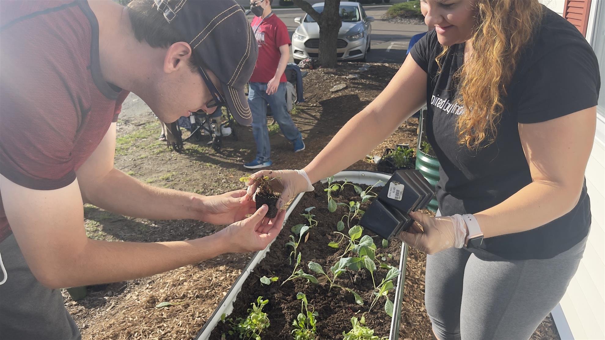 The Vista Rotaract Club organizing plants for the new garden beds, including Rotary liaisons Bill Stableford and Michael Perry